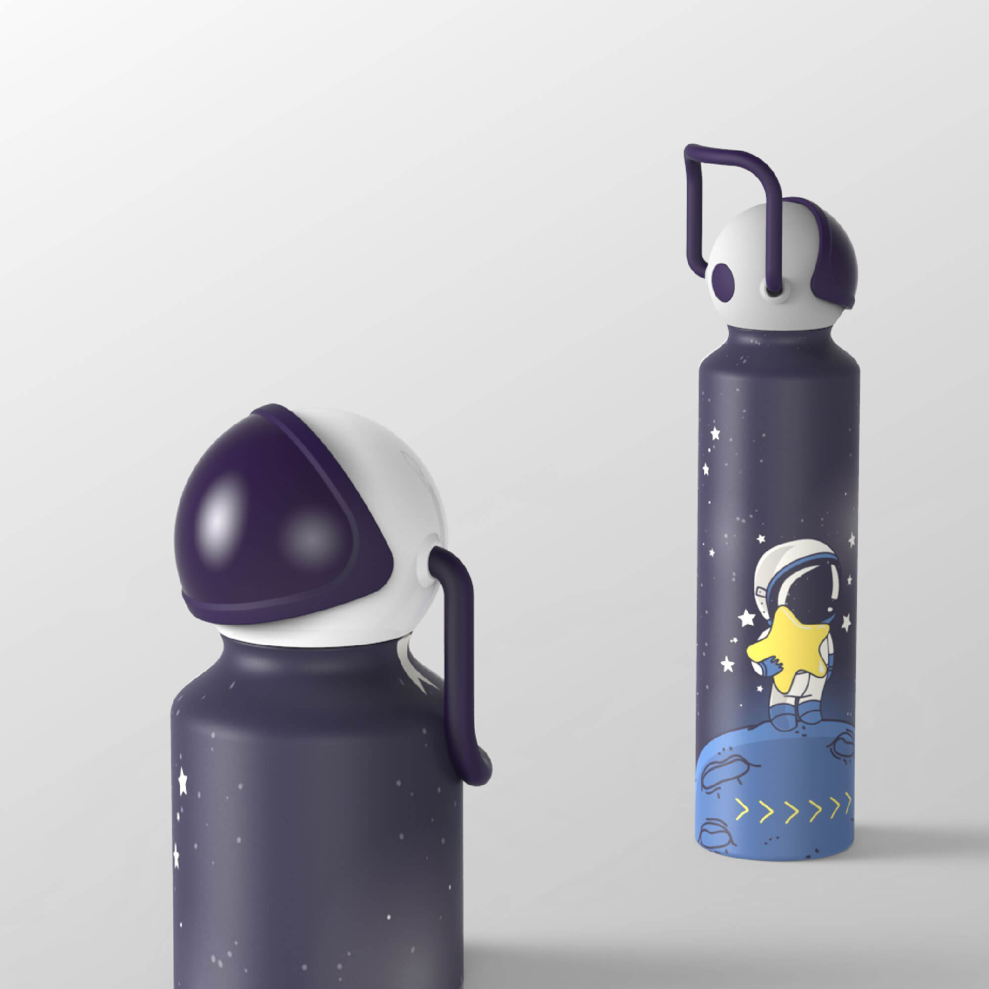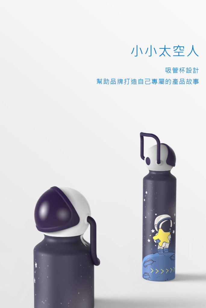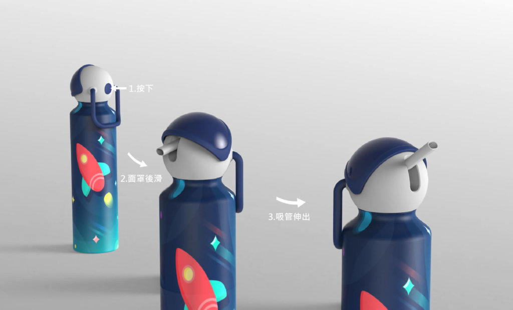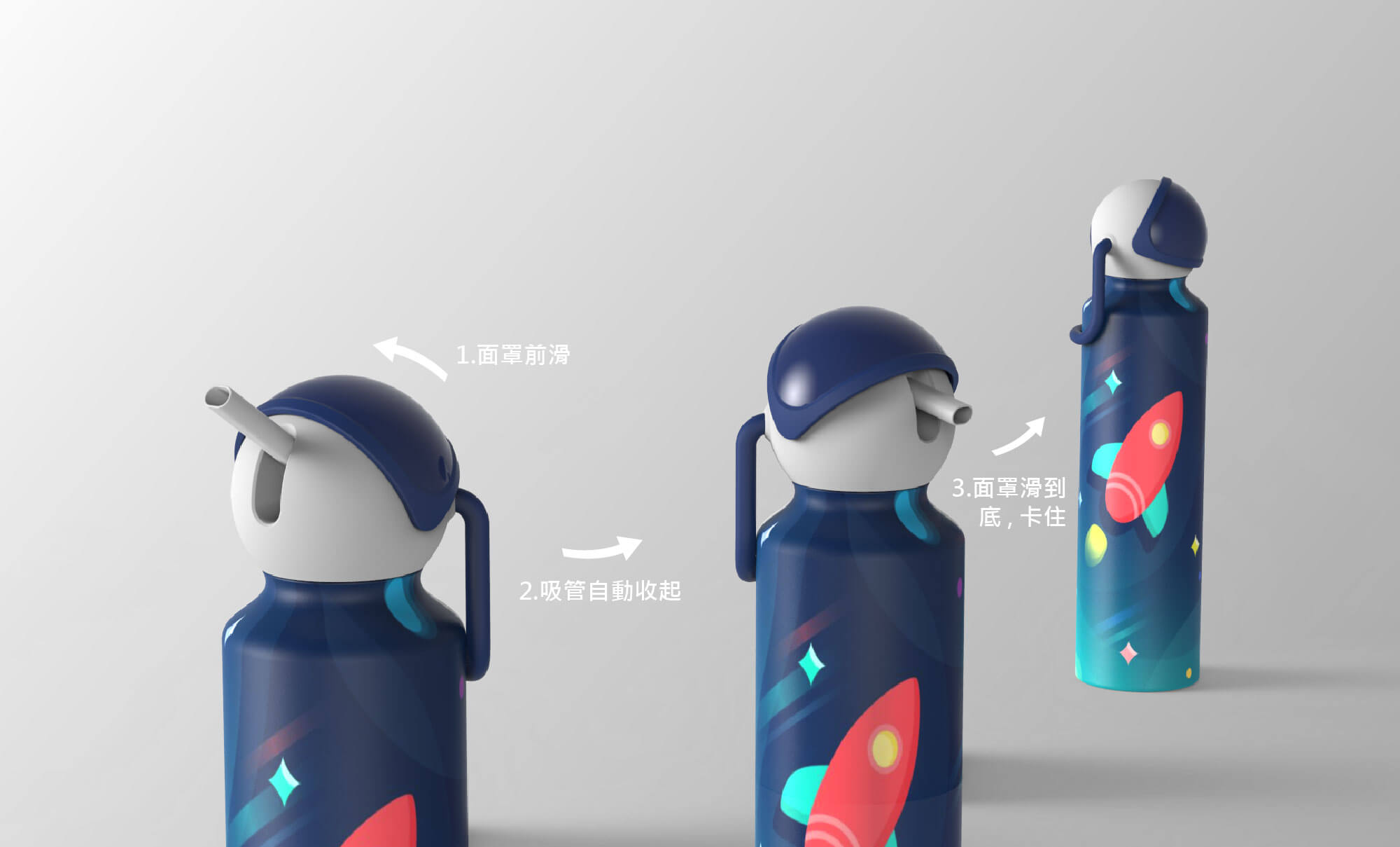造型上 , 將蓋子設計成太空帽的造型 , 有面罩 , 有氧氣管 , 氧氣管往上轉 , 可以成為提環 , 方便父母外出時 , 幫小朋友提著 .