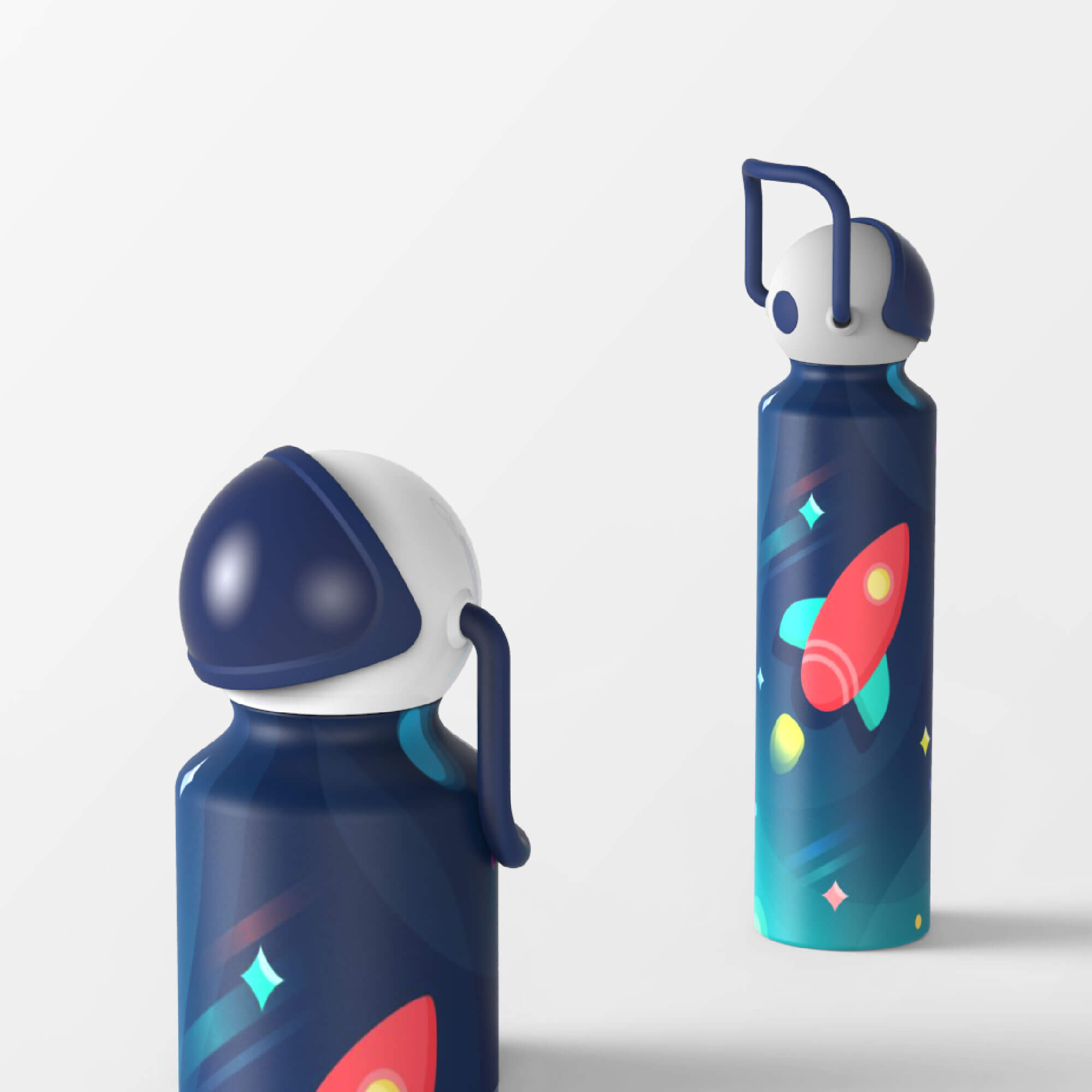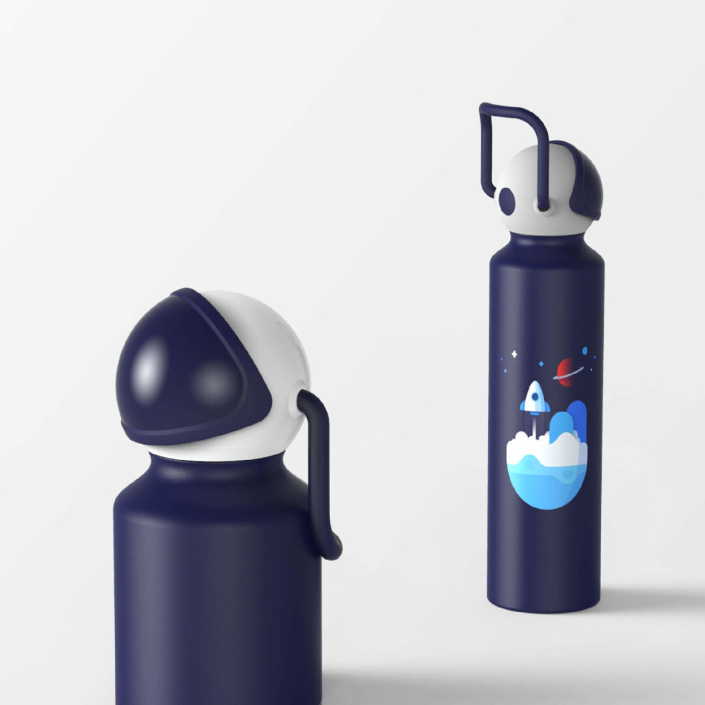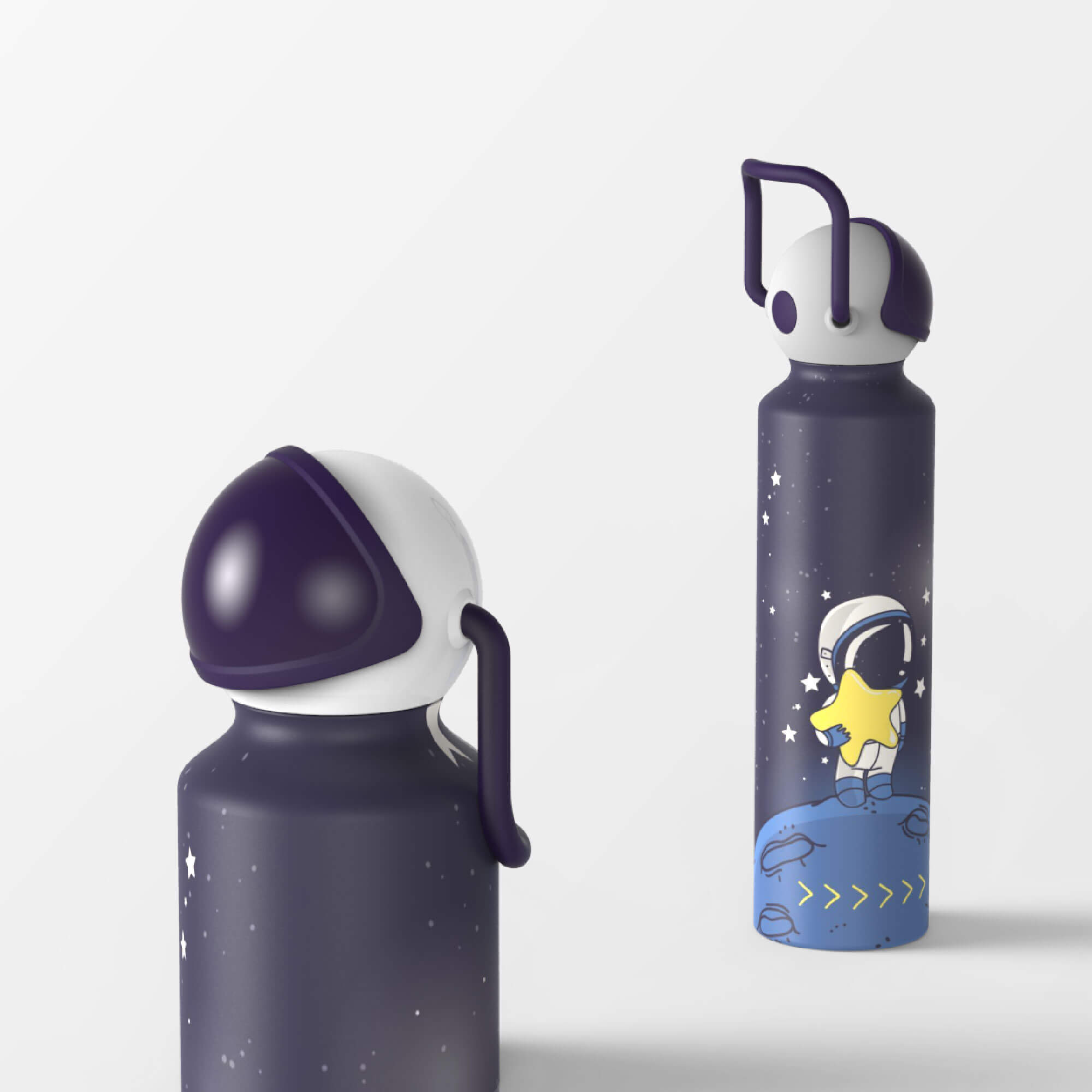 造型上 , 將蓋子設計成太空帽的造型 , 有面罩 , 有氧氣管 , 氧氣管往上轉 , 可以成為提環 , 方便父母外出時 , 幫小朋友提著 .