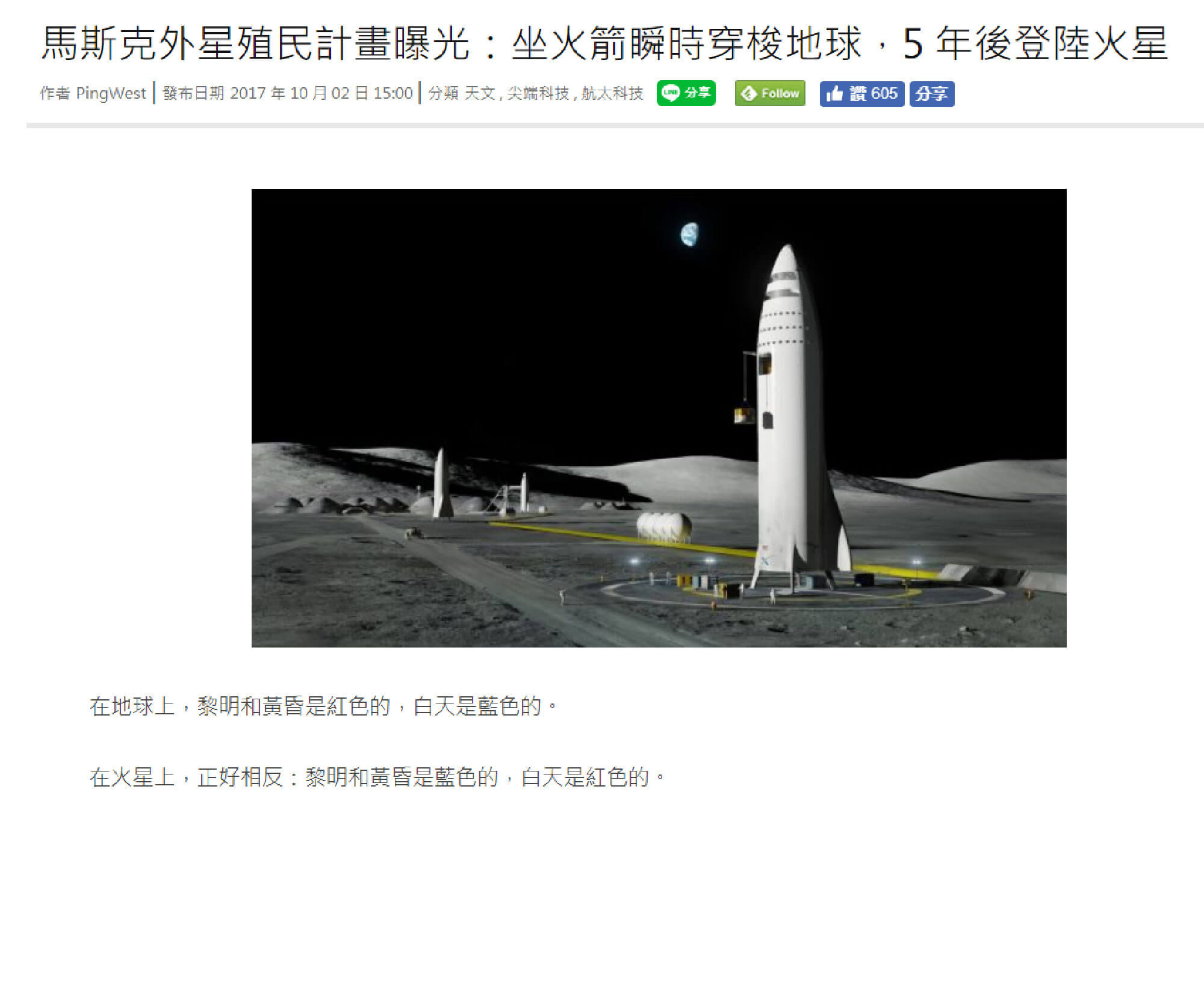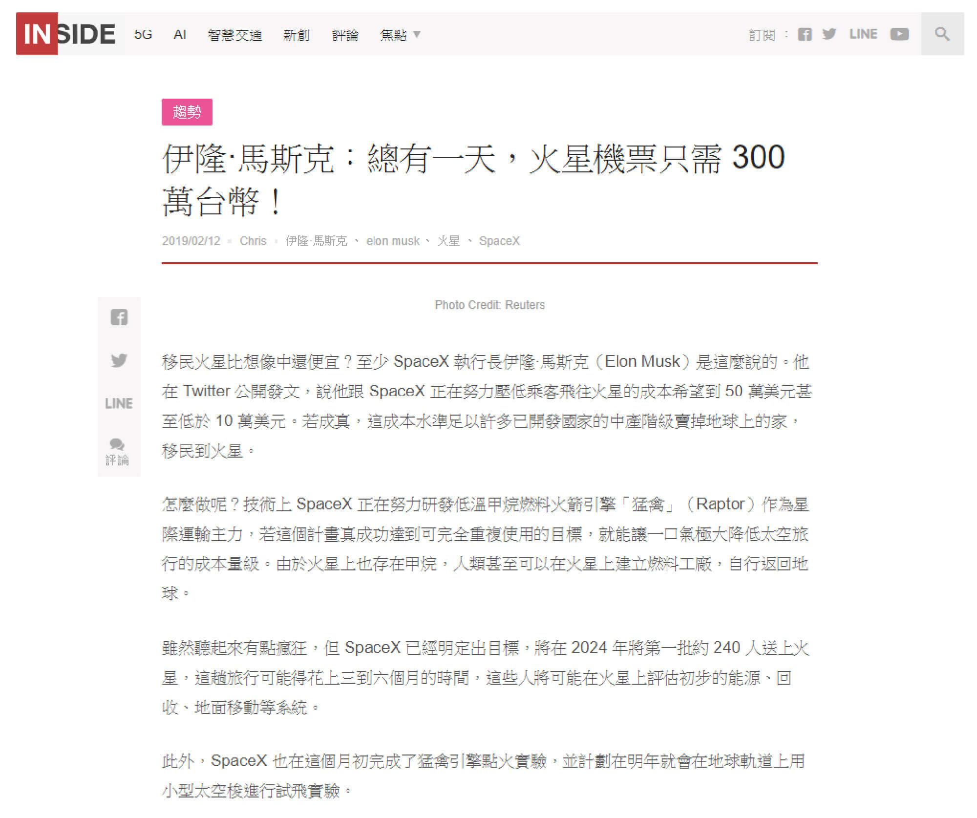 人類即將進入 < 太空的大航海時代 > . 人類即將踏出地球 , 殖民火星是第一步 , 首先必須進入商業化 , 降低成本是最重要的 . SpaceX 研發出可重複發射的火箭 , 並精準地計算出一般人負擔得起的船票 .