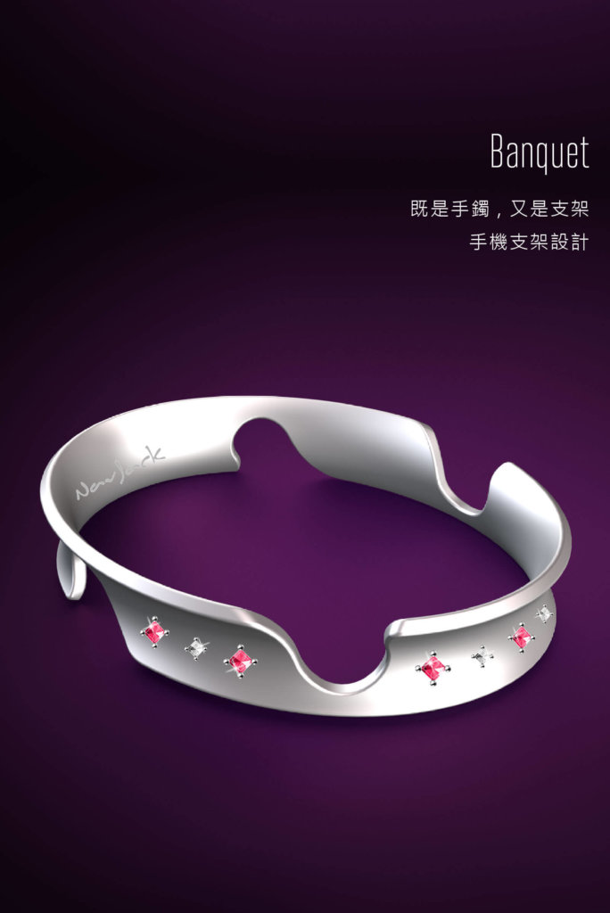 業主希望彰顯品牌精神 , 意圖將奢華的生活概念擴展至整個 3C 產品的周邊 , 故我們企劃了這個專案 . 經過蒐集資料與研究發現 : < 極高的黏著度 > 是最大的特徵 , 手機對於現代人 , 等同於空氣般的存在 . 隨時有觀看影片 , 使用社群軟體等用途 . 因此我們從 < 飾品 X 3C週邊 X 生活型態> 的概念去思考 , 發展出了這個結合手機支架的手鐲 .