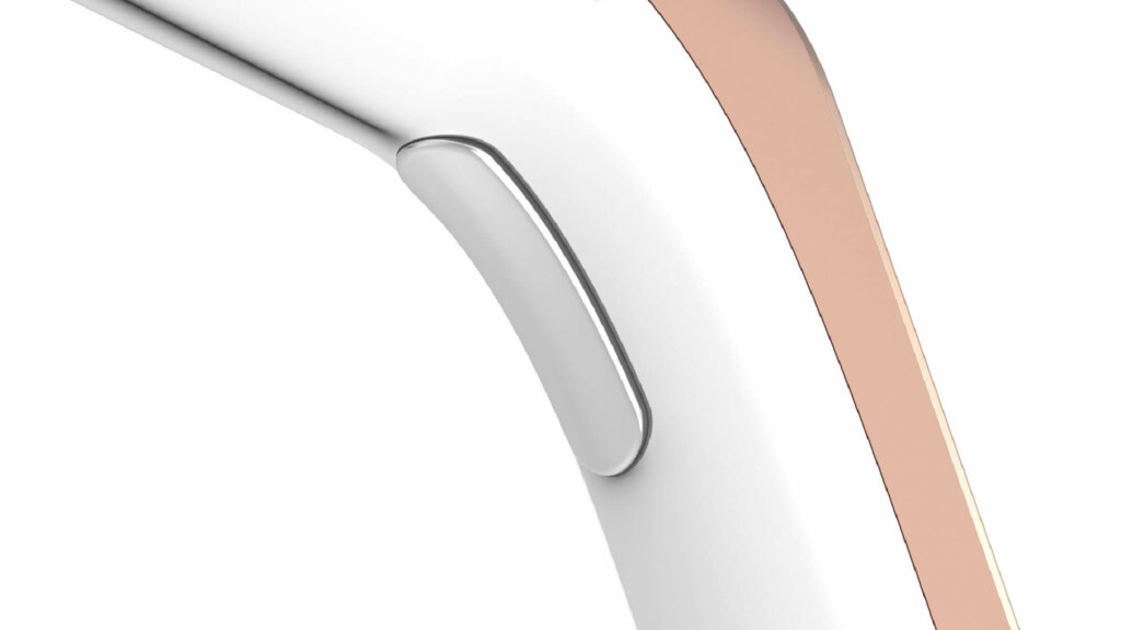 玫瑰金的邊框 , 搭配白色面板 , 槍體背面與按鈕 , LOGO等都以玫瑰金點綴 .
