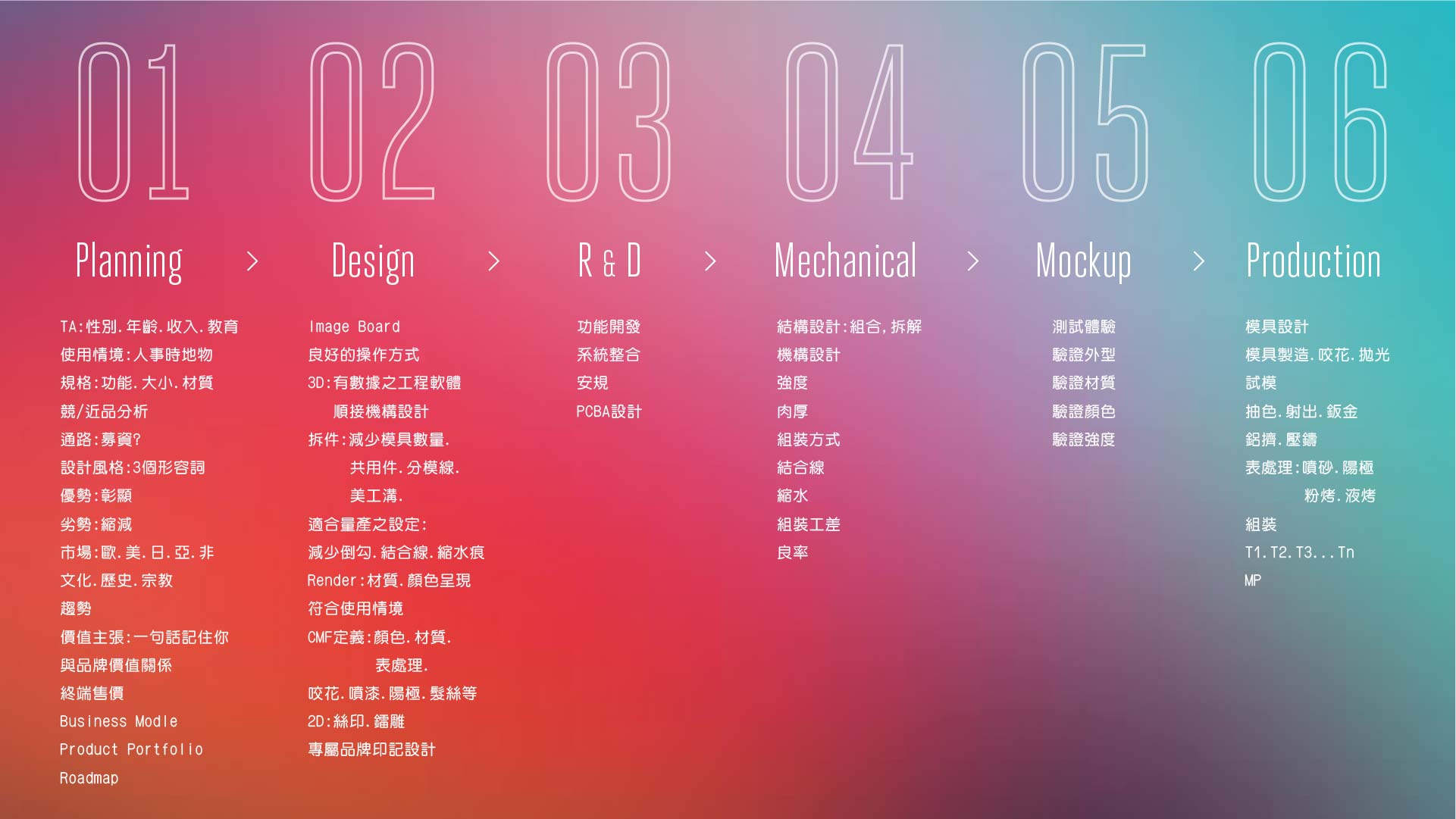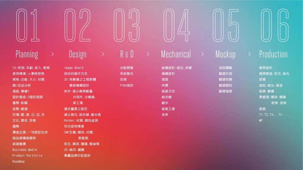 整個產品開發流程分為 6 個步驟 : < 產品企劃 > , < 產品設計 > , < 研發 > , < 機構設計 > , < 模型驗證 > , < 產品量產 > . 圖片中每個步驟的下方是各步驟會完成的具體事項 .